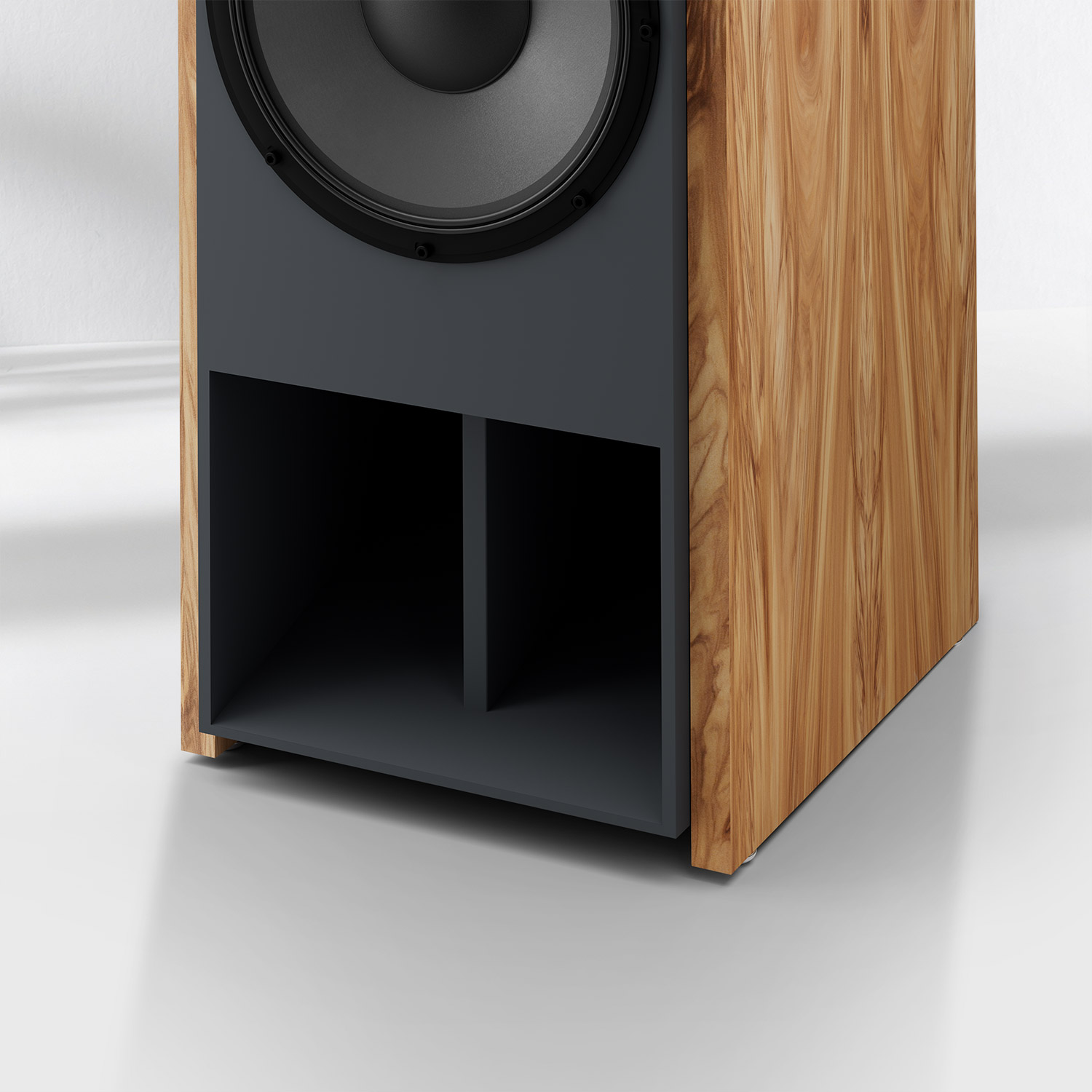 In terms of design, the Master 12 subwoofer largely corresponds to her big brothers the Master 15 and our loudspeaker models, but with a horn loading opening / bass port to the front. This front-facing bass port enables direct coupling to the room and the entire music system.